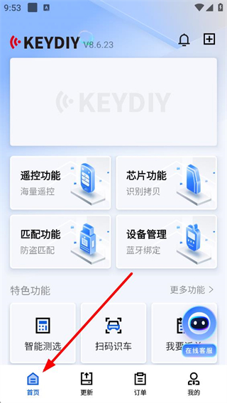 1、進入首頁可看到遙控功能、芯片功能、匹配功能、設備管理等功能入口,還有智能測選、掃碼識車等特色功能,可根據需求使用功能。