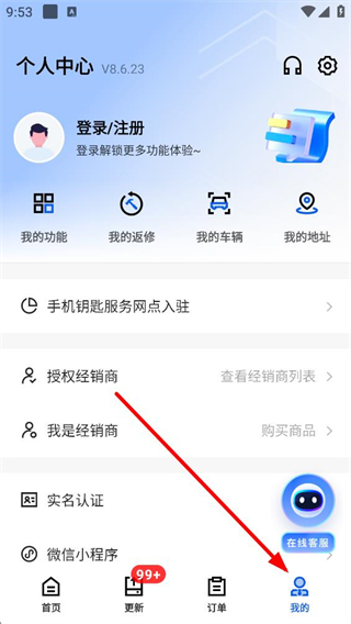 2、點擊我的進入個人中心,能看到登錄、注冊入口,還有我的功能、我的返修、我的車輛等功能選項,可管理個人相關事務。