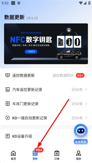 4、進入更新頁面,可看到遙控數據更新、汽車遙控更新記錄等數據更新選項,還有KD設備升級入口,可進行數據更新和設備升級。
