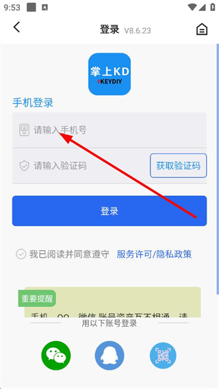 3、登錄頁面可選擇手機登錄,輸入手機號和驗證碼即可登錄,也可選擇微信、QQ等第三方登錄方式。