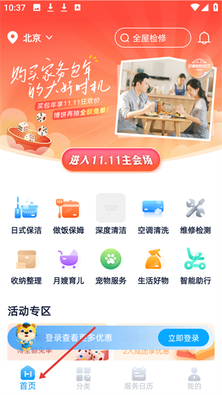 2、首頁北京有11.11家務包年活動,功能入口含日式保潔等,服務涵蓋收納整理等,活動專區可登錄看優惠。
