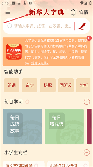 1、打開新華大字典APP首頁呈紅色調設有組詞、造句等多樣功能板塊,每日學習引人注目還專為小學生打造了學習專欄。