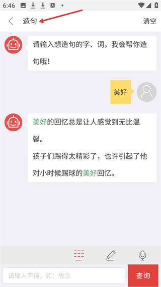 2、造句功能頁輸入字詞如美好,會生成相關句子,像美好的回憶總是讓人感覺到無比溫馨等,助力學習運用字詞。