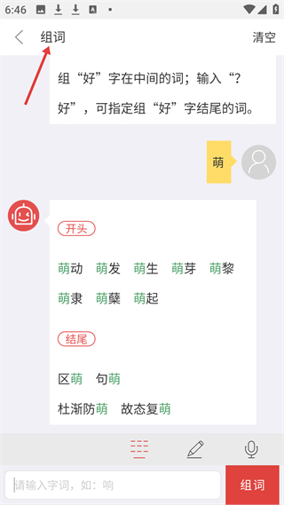 3、組詞功能頁輸入漢字如萌,按開頭含萌、結尾含萌分組,呈現萌動區萌等詞,部分附釋義,高效拓展詞匯量。