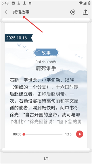 4、成語故事頁展示鹿死誰手的故事,介紹石勒相關典故,還有音頻可播放,能幫助用戶了解成語出處與含義。