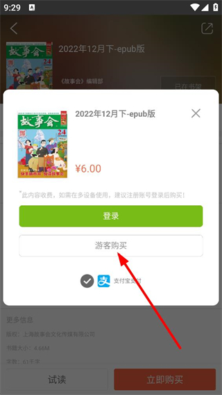 3、點擊立即購買后,會彈出登錄或游客購買的選項,若選擇游客購買,可通過支付寶支付,方便快捷完成購買流程。