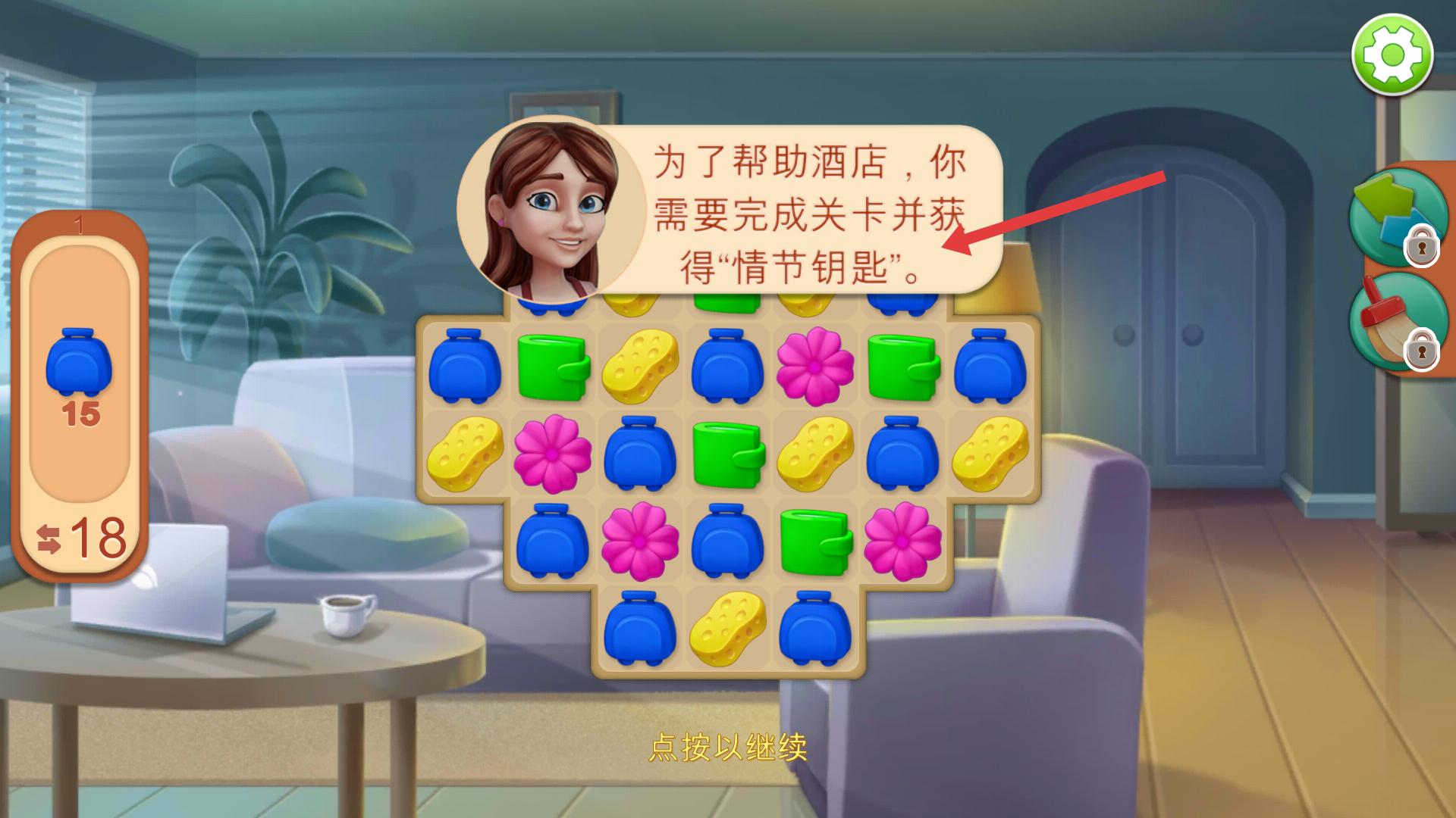 1、游戲提示為幫助酒店,需完成關卡并獲得情節鑰匙,所以要專注完成關卡任務,獲取該鑰匙,推進游戲劇情。