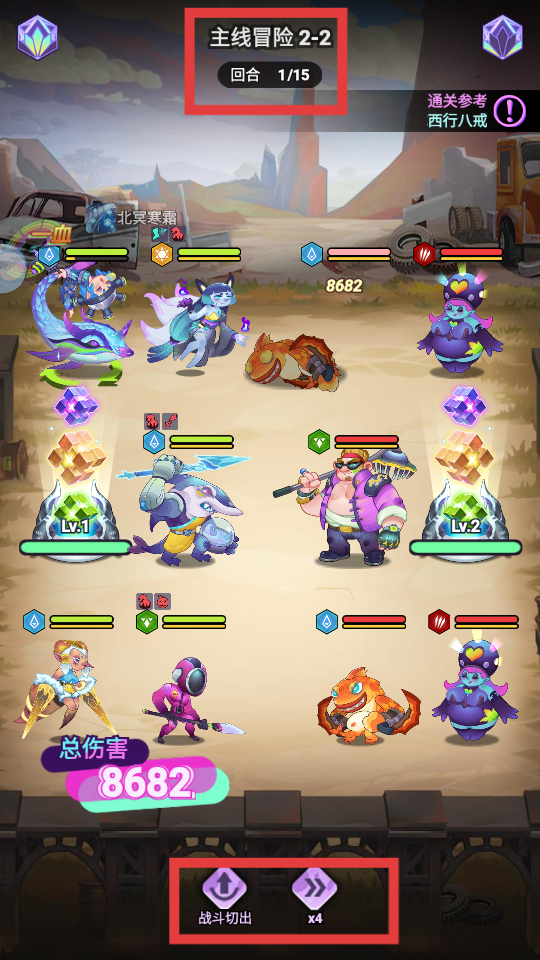 3、進入戰斗界面顯示回合數,下方有戰斗切出和倍數加速按鈕,戰斗中需合理搭配角色技能,利用加速功能可加快戰斗節奏,快速完成回合挑戰敵人。