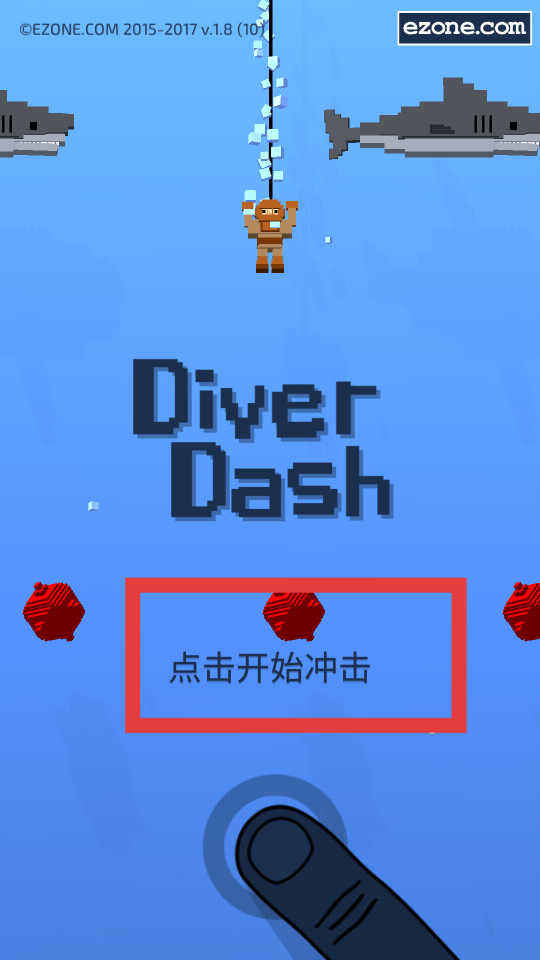1、玩家下載游戲之后玩家在游戲初始界面,點擊圖標標記的點擊開始沖擊按鈕,潛水員就會開始下潛,進入深海游戲場景,開啟游戲挑戰。