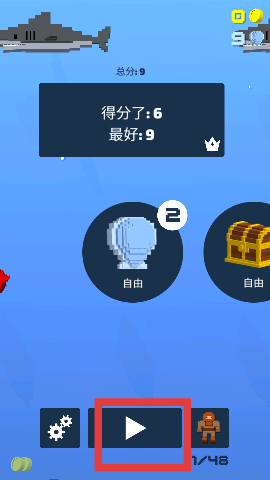 2、游戲過程中潛水員會持續下降,玩家需要控制潛水員躲避紅色的炸彈以及像鯊魚這樣的危險生物,一旦碰到炸彈或被鯊魚咬到,游戲就會結束。