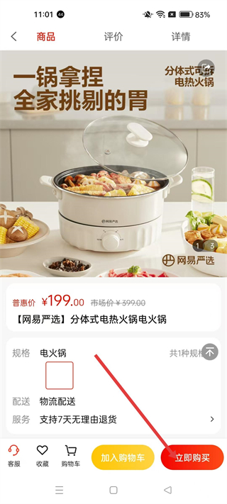 4、進入分體式電熱火鍋商品詳情頁,可查看商品價格、規格、配送及服務信息,可選擇加入購物車或立即購買,享受普惠價購物體驗。