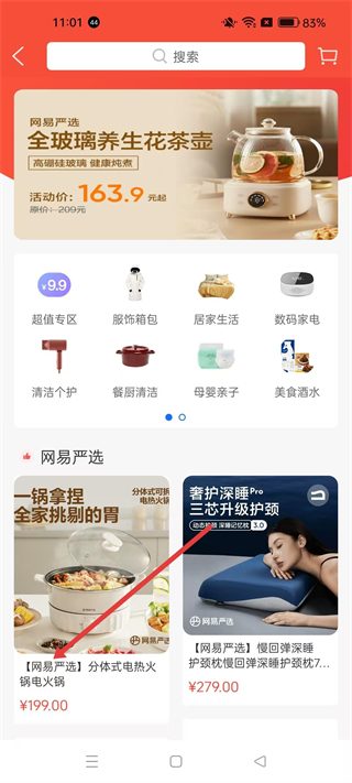 3、普惠商城中點擊網易嚴選板塊的商品,進入商品列表頁,可看到全玻璃養生花茶壺、分體式電熱火鍋等商品,標注了活動價和原價,方便用戶選擇心儀商品。