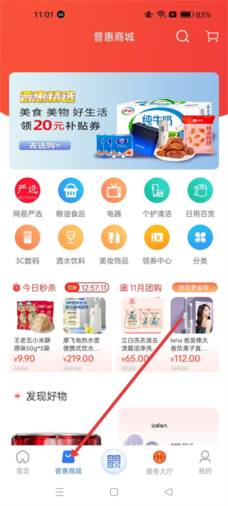2、點擊普惠商城進入商城頁面,可看到普惠精選活動,有網易嚴選、糧油食品等分類入口,還有今日秒殺、11月團購等商品推薦,滿足用戶購物需求。