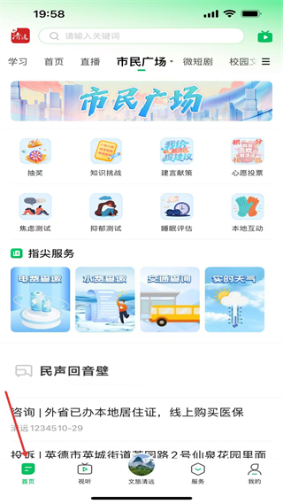 1、首頁市民廣場有抽獎、知識挑戰等互動功能,指尖服務可查繳水電交通天氣,還有民聲回音壁處理民生咨詢投訴。