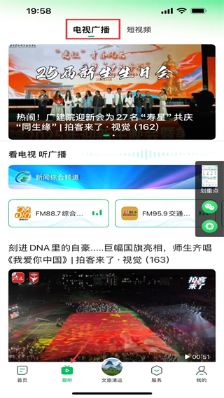 2、視聽板塊,分電視廣播、短視頻分類,可收看新聞頻道、收聽FM88.7/95.9廣播,發布廣建院迎新會、巨幅國旗等視聽資訊。