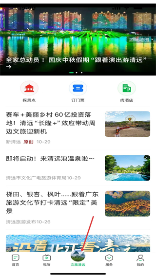 3、文旅清遠板塊,提供探景點、訂門票、找酒店服務,發布清遠長隆文旅新機、溫泉啟動、旅游文化節打卡等文旅資訊。