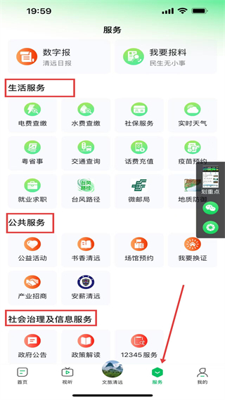 4、 服務板塊,整合數字報、民生報料功能,生活服務含水電社保等,公共服務有公益書香等,還有社會治理及信息服務如政務府公告、12345服務。