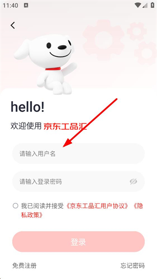 3、進入登錄界面,需輸入用戶名和登錄密碼,勾選用戶協議和隱私政策后點擊登錄,也可選擇免費注冊,進入用戶注冊流程。