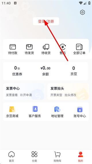 2、我的頁面顯示未登錄狀態,有訂單管理、優惠券等功能選項,點擊登錄注冊按鈕,即可進入登錄界面,準備進行賬號登錄操作。
