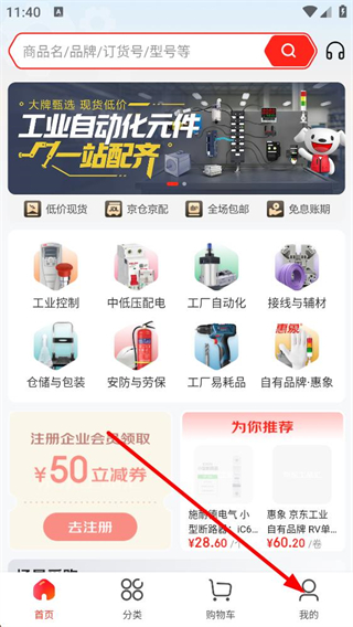 1、進入應用首頁,可看到工業自動化元件等分類入口,還有低價現貨等服務標識及商品推薦,底部有首頁、分類等功能按鈕,點擊我的可進入個人頁面。