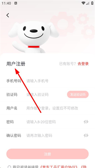 4、進入用戶注冊界面,需依次填寫手機號碼、獲取并填寫驗證碼,設置用戶名及密碼,勾選協議后點擊注冊,即可完成賬號注冊。