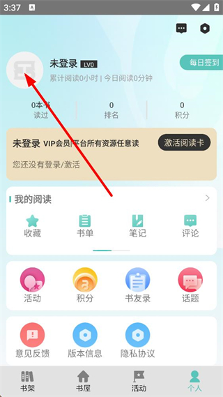 2、進入個人頁面,顯示未登錄狀態,有每日簽到及我的閱讀相關功能模塊,點擊未登錄區域,即可進入賬號的登錄相關界面。