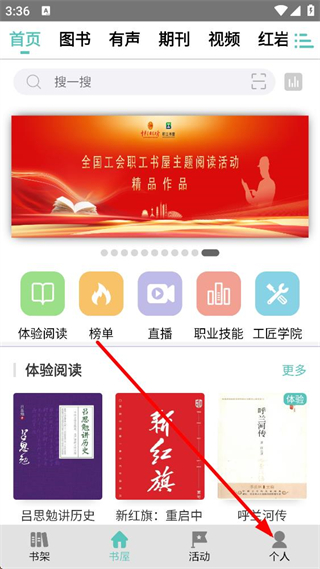 1、進入職工書屋首頁,可看到圖書有聲等欄目,還有體驗閱讀榜單等功能入口,底部設有個人選項,點擊該選項即可進入個人相關操作頁面。