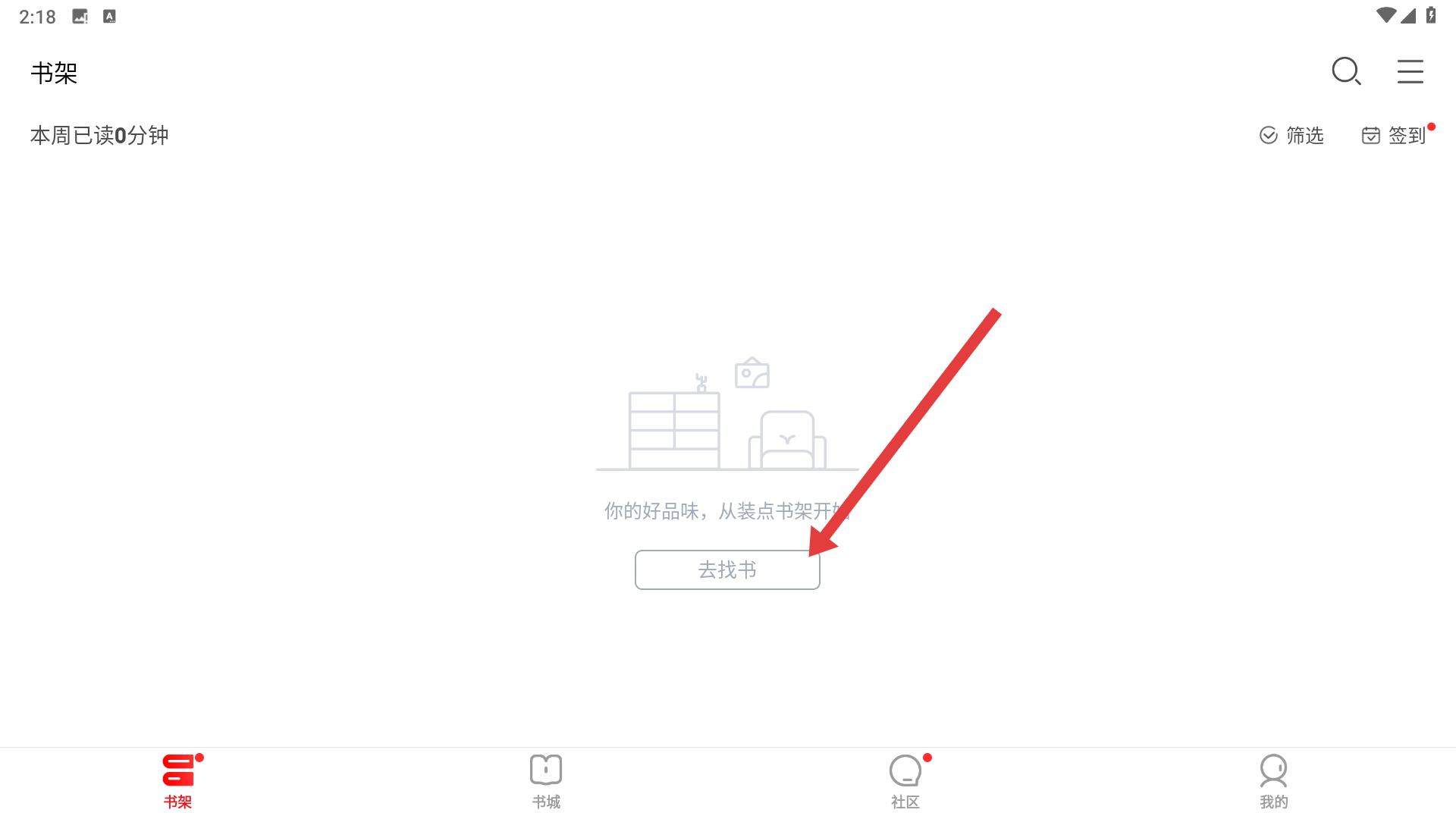 2、書架界面,可見本周已讀時長,點擊去找書可進入書城挑選書籍,裝點自己的書架。