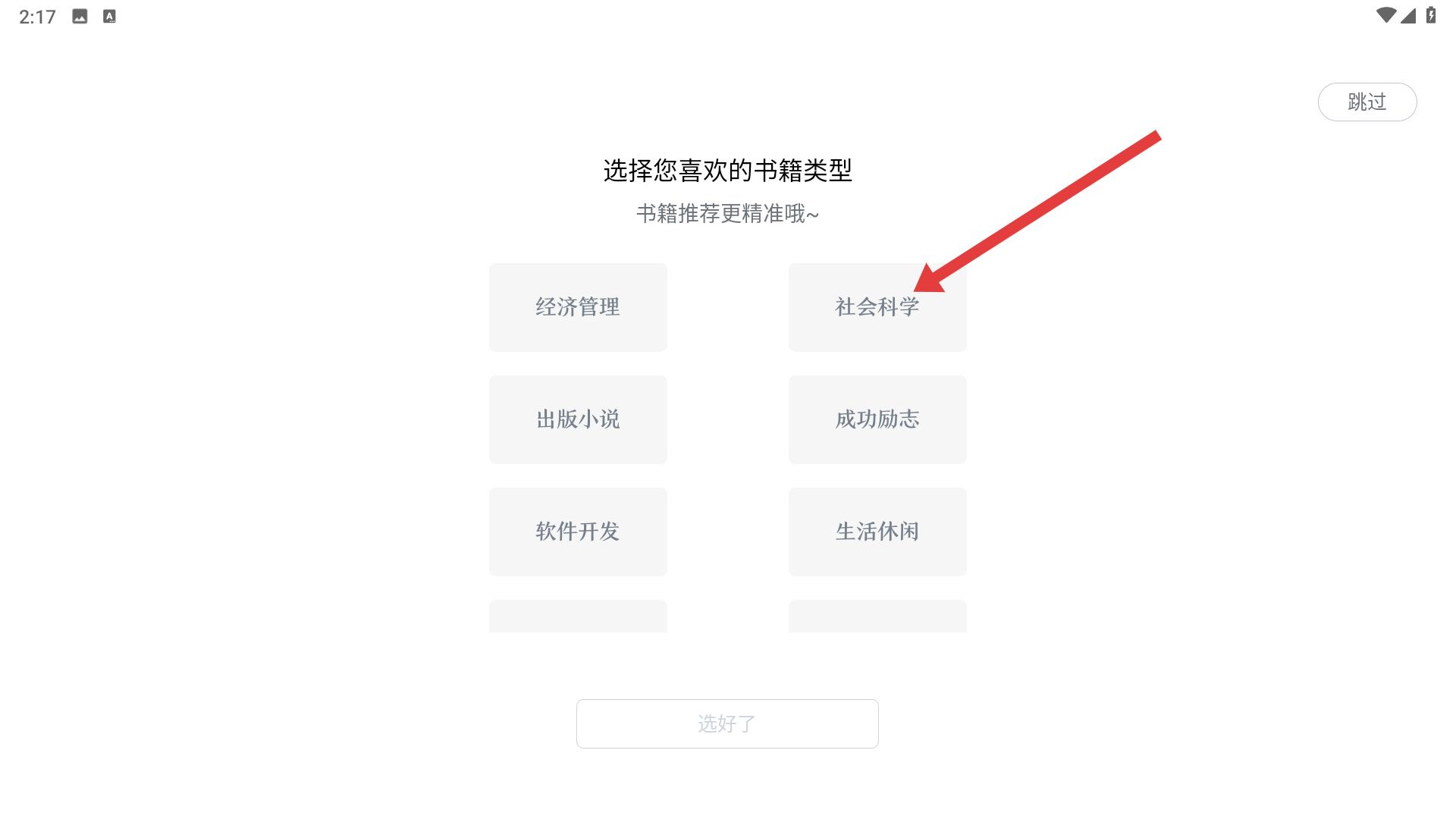 1、進入應用可選擇喜歡的書籍類型,如社會科學、經濟管理等,選擇后書籍推薦更精準,也可點擊跳過直接進入應用。