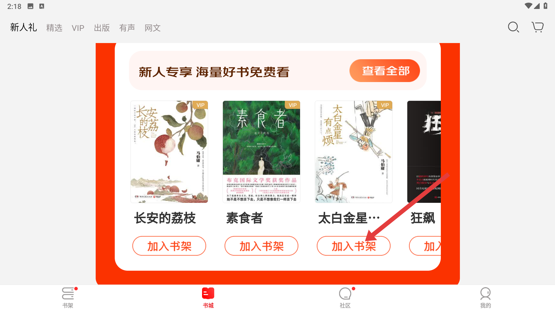 3、進入書城新人禮板塊,有海量好書免費看,可將長安的荔枝、素食者等書籍加入書架,豐富閱讀資源。
