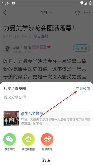 4、在分享界面選擇微信朋友圈渠道,點擊立即轉發按鈕,將該資訊內容分享至微信朋友圈。