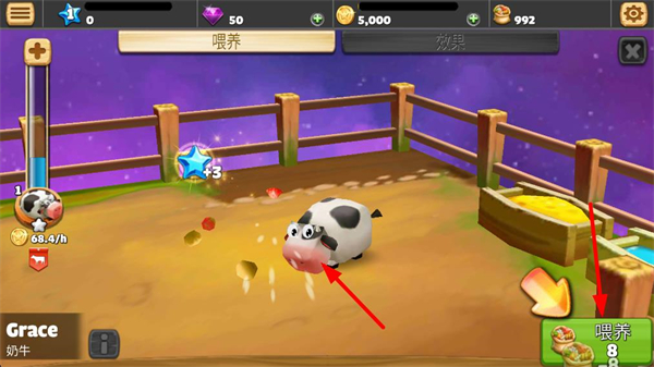 4、進入喂養界面,點擊喂養按鈕消耗食物喂養奶牛,喂養后可提升奶牛狀態,同時獲得星星獎勵,持續養成寵物。