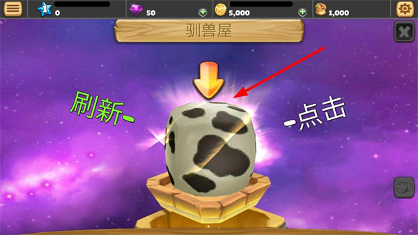 1、在馴獸屋界面,點擊刷新獲取寵物,比如奶牛樣式的寵物,完成寵物的獲取流程,開啟寵物養成的初始步驟。