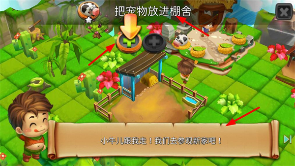 3、將寵物放進棚舍,跟隨指引帶奶牛參觀新家,完成奶牛的安置流程,讓奶牛適應新環境,助力后續養成。