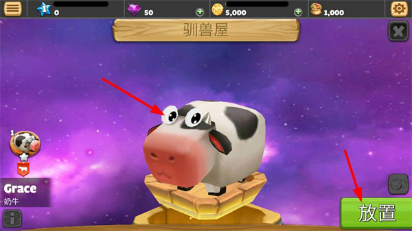 2、獲取寵物后點擊放置按鈕,將奶牛寵物安置到對應區域,完成寵物的初始放置,推進寵物養成的進程。