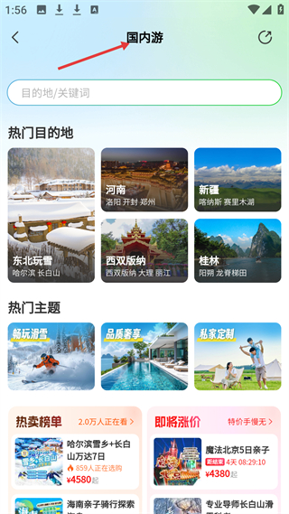 1、國內游頁熱門目的地有東北玩雪、河南等,熱門主題含滑雪、奢享等,熱賣榜有哈爾濱雪鄉產品,2.0萬人關注。
