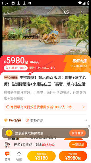 2、西雙版納產品頁,主推爆款奢玩行程5980元起,含旅拍研學,住洲際酒店和小熊貓莊園,2506人報名,寒假大促可拼單。