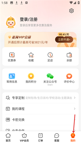 4、我的頁可登錄注冊,有優惠券、收藏等入口,可開通VIP享優惠,管理訂單、客服,查積分和足跡。