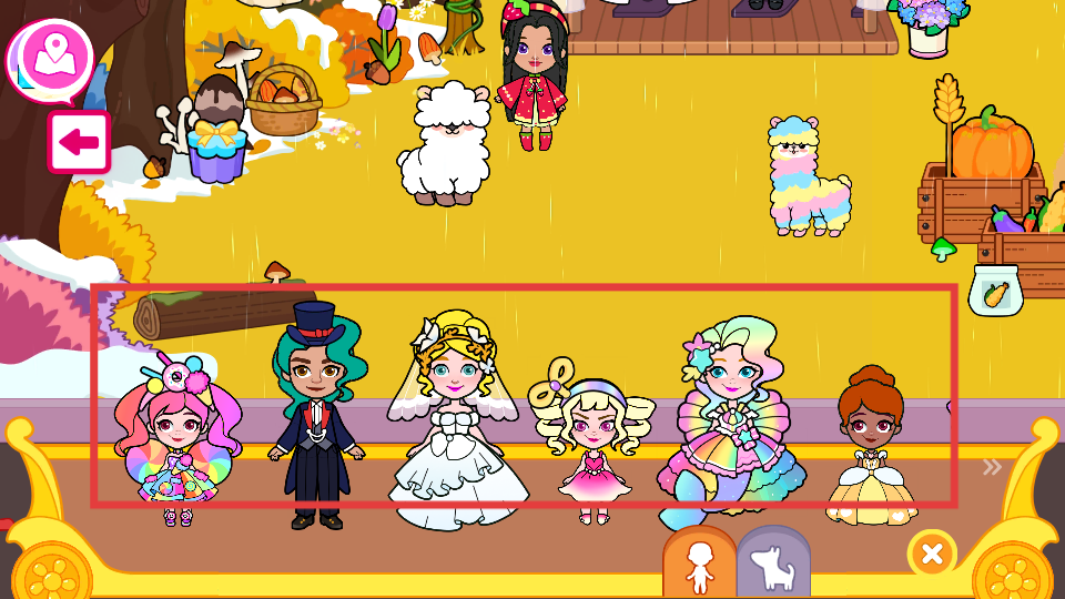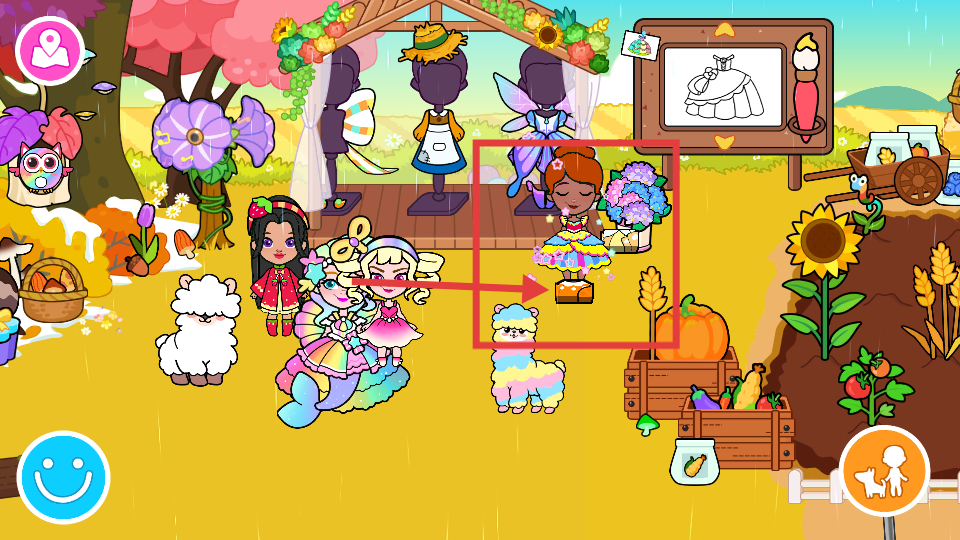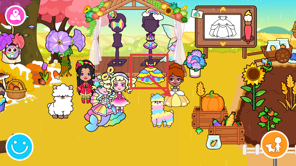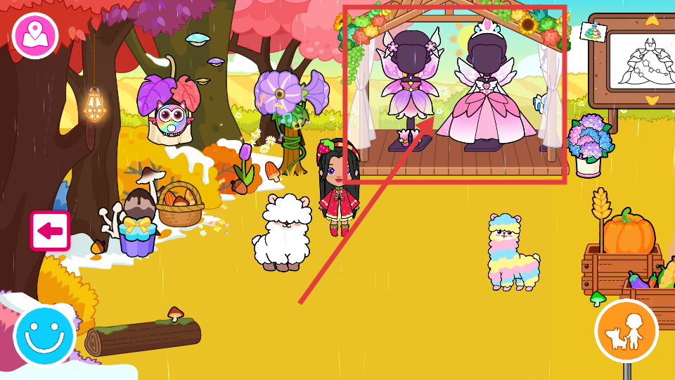 1、進入紙公主的幻想生活游戲后,在場景中尋找帶有服飾展示的區域,如圖中搭建的小亭子樣式區域,里面陳列著不同款式的衣服,這就是可以進行換裝操作的地方。