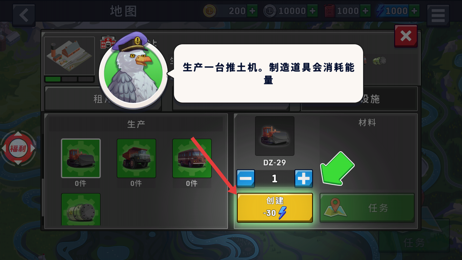 1、在生產界面,選擇推土機進行生產,點擊創建按鈕,消耗30能量即可制造出推土機,制造道具會消耗能量,需留意能量值。