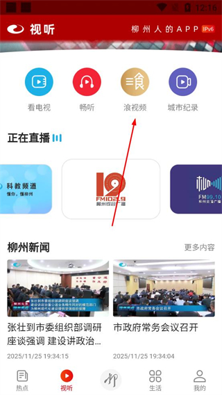 1、打開在柳州APP進入首頁,瀏覽看電視暢聽等功能入口,找到演視頻板塊并點擊,進入對應頁面查看各類視頻內容,開啟瀏覽流程。