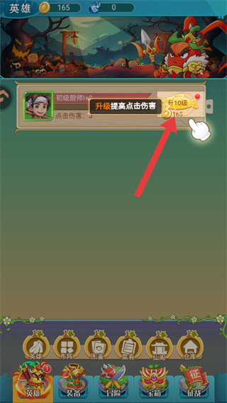 2、在英雄界面,可升級提高點擊傷害,消耗金幣進行升級,提升角色的攻擊能力,讓戰斗更輕松。