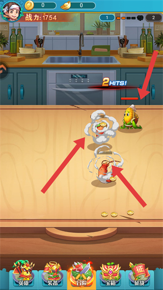3、戰斗的過程,角色會與多種美食敵人交鋒,釋放技能攻擊敵人,擊敗敵人可獲得金幣等獎勵,推進游戲進程。