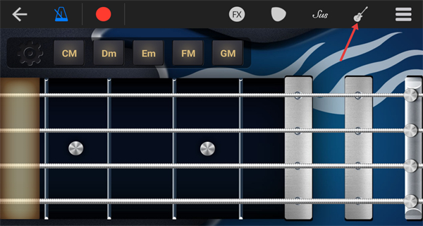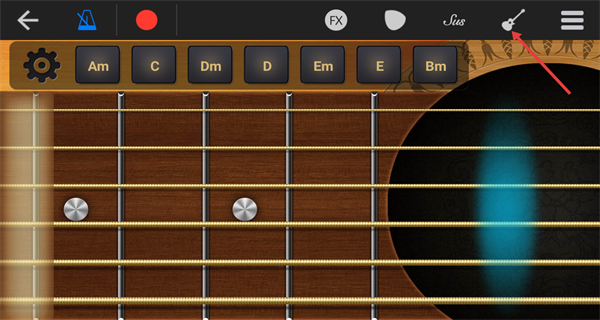 3、電吉他模擬界面,有CM、Dm、Em等和弦按鈕,界面呈現電吉他樣式,用戶可模擬彈奏,感受電吉他獨特的搖滾音色。