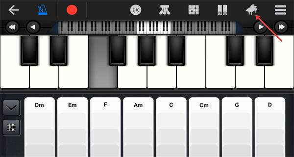 4、鋼琴模擬界面,具備Dm、Em、F等和弦按鈕,界面還原鋼琴鍵盤布局,用戶可彈奏鋼琴,嘗試不同和弦組合的音樂效果。