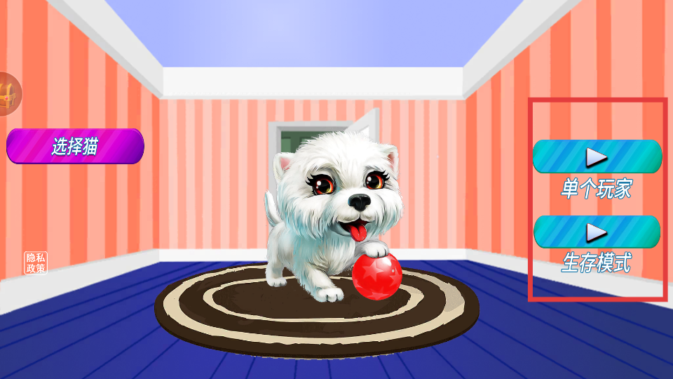 1、游戲初始界面有可愛小狗,右側有單個玩家和生存模式選項,可根據喜好選擇,左側選擇貓按鈕能切換寵物為貓開啟不同體驗。