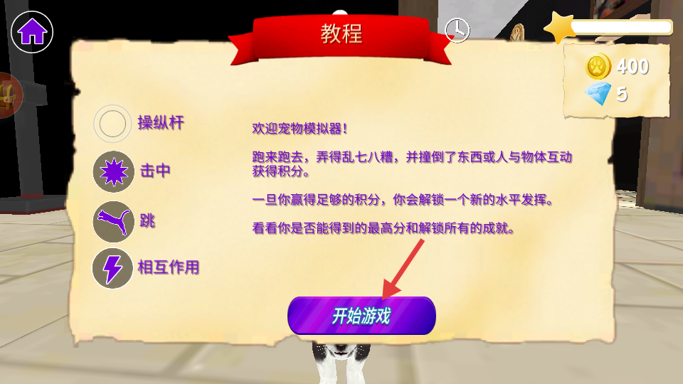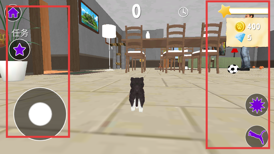 4、游戲中左側有任務按鈕和移動操縱桿,右側有擊中、跳等操作按鈕,還有積分和鉆石顯示,通過操縱桿移動寵物,用右側按鈕互動、拆家獲取積分。