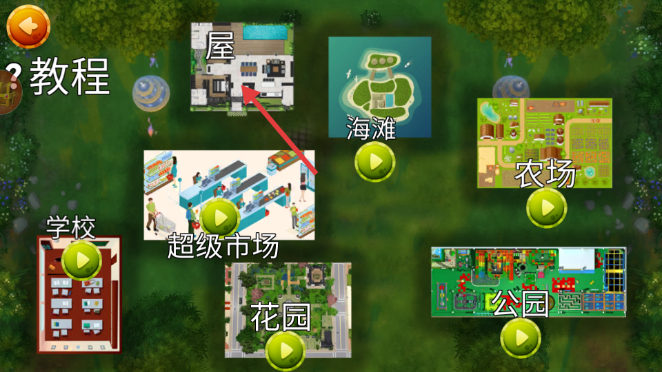 2、進入場景選擇界面,有屋、海灘、農場等多個場景,點擊對應場景的綠色按鈕,即可進入該場景開始游戲,不同場景有不同拆家樂趣。