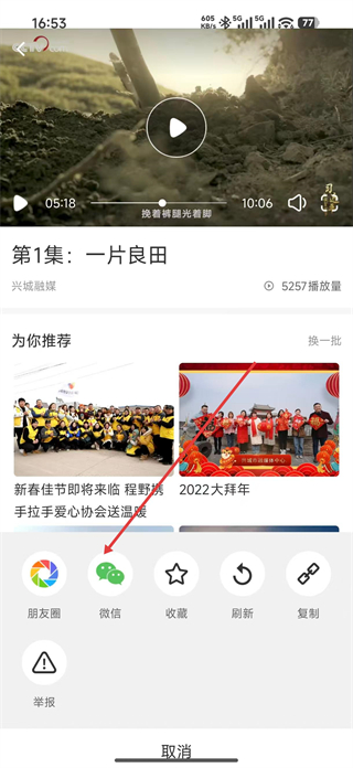 4、可選擇朋友圈、微信等分享方式,將視頻分享給他人,也可進行收藏、刷新等。