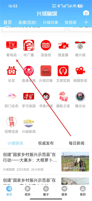 1、進入興城融媒app,可查看看電視、聽廣播等功能入口,了解小城快訊、權威發布等本地資訊,點擊看電視可進入電視節目播放頁面。